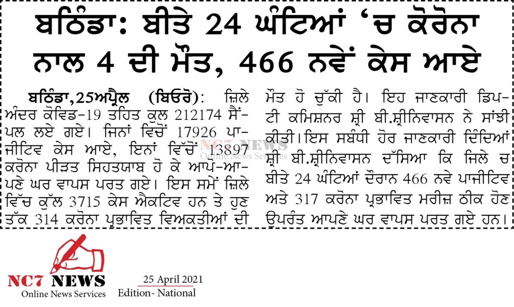 ਬਠਿੰਡਾ, 25 ਅਪ੍ਰੈਲ(ਬਿਓਰੋ): ਜ਼ਿਲੇ ਅੰਦਰ ਕੋਵਿਡ-19 ਤਹਿਤ ਕੁਲ 212174 ਸੈਂਪਲ ਲਏ ਗਏ। ਜਿਨਾਂ ਵਿਚੋਂ 17926 ਪਾਜੀਟਿਵ ਕੇਸ ਆਏ, ਇਨਾਂ ਵਿੱਚੋਂ 13897 ਕਰੋਨਾ ਪੀੜਤ ਸਿਹਤਯਾਬ ਹੋ ਕੇ ਆਪੋ-ਆਪਣੇ ਘਰ ਵਾਪਸ ਪਰਤ ਗਏ। ਇਸ ਸਮੇਂ ਜ਼ਿਲੇ ਵਿੱਚ ਕੁੱਲ 3715 ਕੇਸ ਐਕਟਿਵ ਹਨ ਤੇ ਹੁਣ ਤੱਕ 314 ਕਰੋਨਾ ਪ੍ਰਭਾਵਿਤ ਵਿਅਕਤੀਆਂ ਦੀ ਮੌਤ ਹੋ ਚੁੱਕੀ ਹੈ। ਇਹ ਜਾਣਕਾਰੀ ਡਿਪਟੀ ਕਮਿਸ਼ਨਰ ਸ਼੍ਰੀ ਬੀ.ਸ਼੍ਰੀਨਿਵਾਸਨ ਨੇ ਸਾਂਝੀ ਕੀਤੀ।ਇਸ ਸਬੰਧੀ ਹੋਰ ਜਾਣਕਾਰੀ ਦਿੰਦਿਆਂ ਸ਼੍ਰੀ ਬੀ.ਸ਼੍ਰੀਨਿਵਾਸਨ ਦੱਸਿਆ ਕਿ ਜਿਲੇ ਚ ਬੀਤੇ 24 ਘੰਟਿਆਂ ਦੌਰਾਨ 466 ਨਵੇ ਪਾਜੀਟਿਵ ਅਤੇ 317 ਕਰੋਨਾ ਪ੍ਰਭਾਵਿਤ ਮਰੀਜ਼ ਠੀਕ ਹੋਣ ਉਪਰੰਤ ਆਪਣੇ ਘਰ ਵਾਪਸ ਪਰਤ ਗਏ ਹਨ।